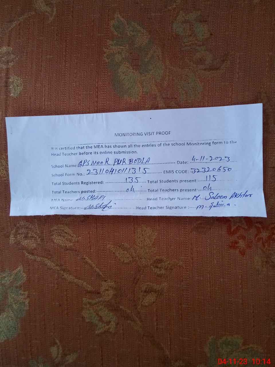 | Attendance Register | Head Teacher | MEA with School | Visit Proof |