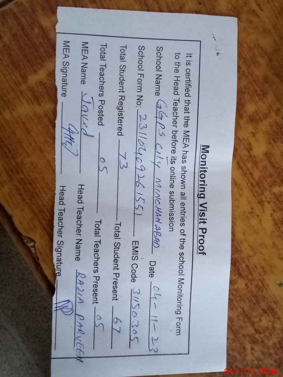 | Attendance Register | Head Teacher | MEA with School | Visit Proof |