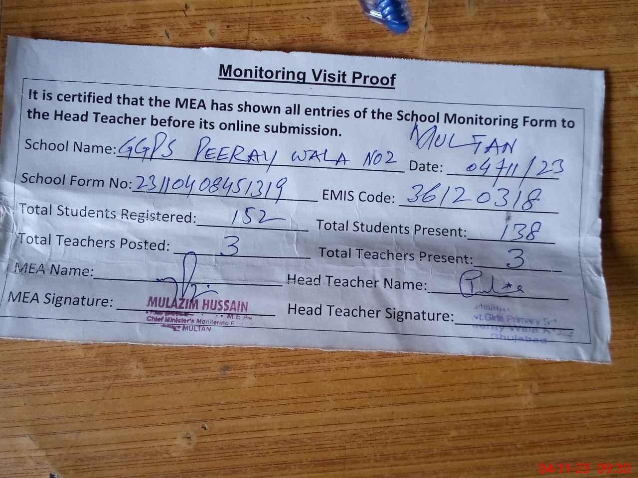 | Attendance Register | Head Teacher | MEA with School | Visit Proof |