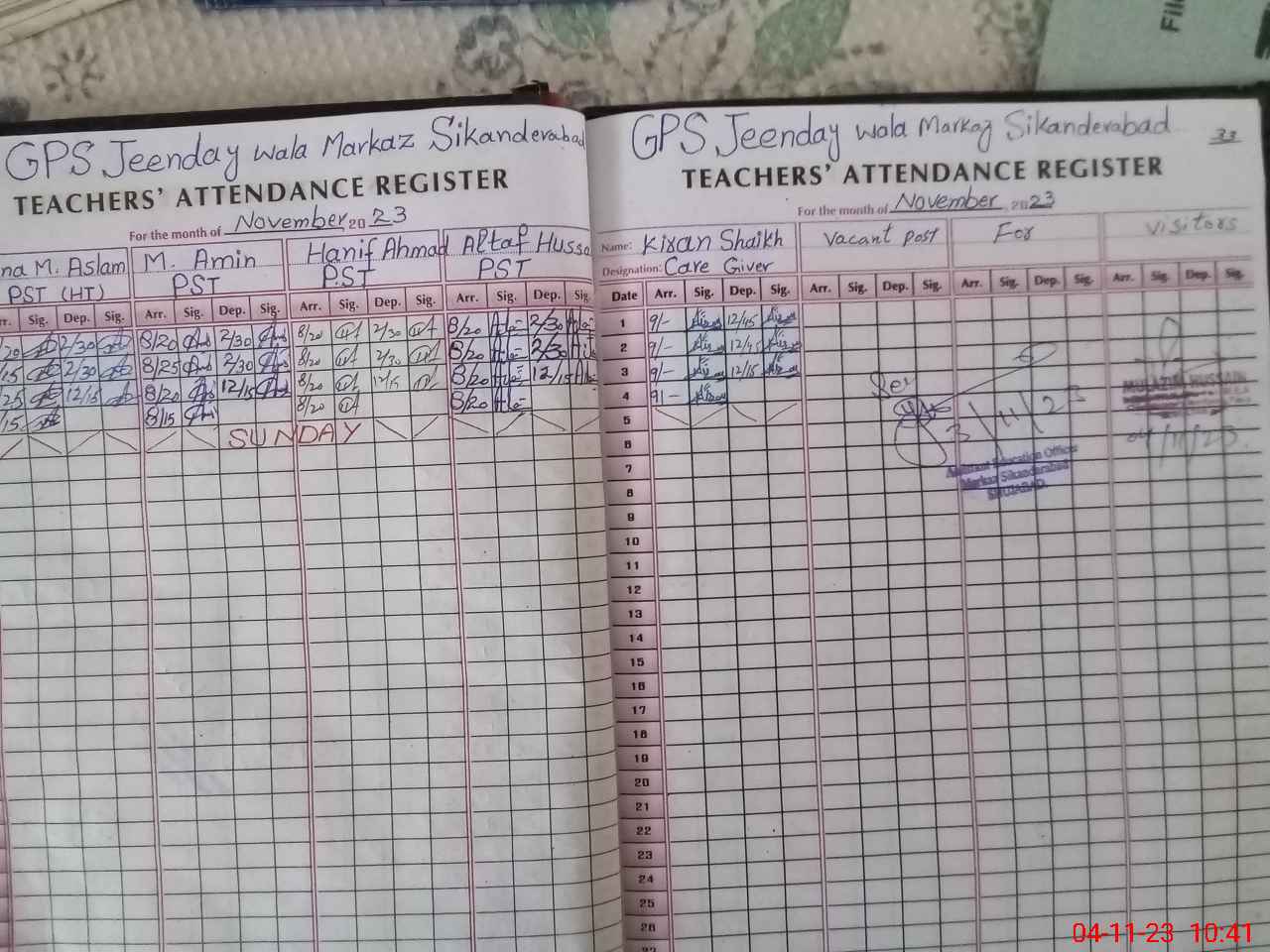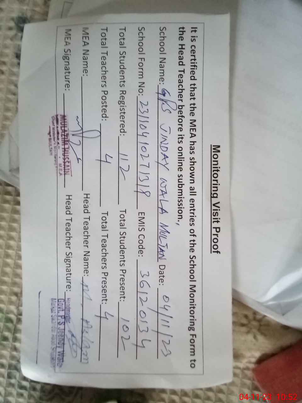 | Attendance Register | Head Teacher | MEA with School | Visit Proof |