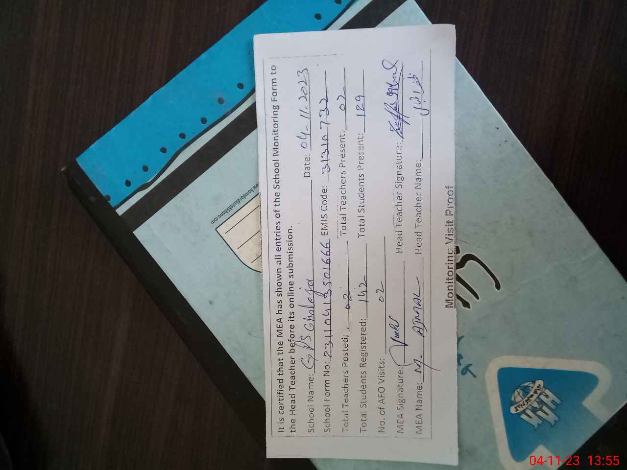| Attendance Register | Head Teacher | MEA with School | Visit Proof |