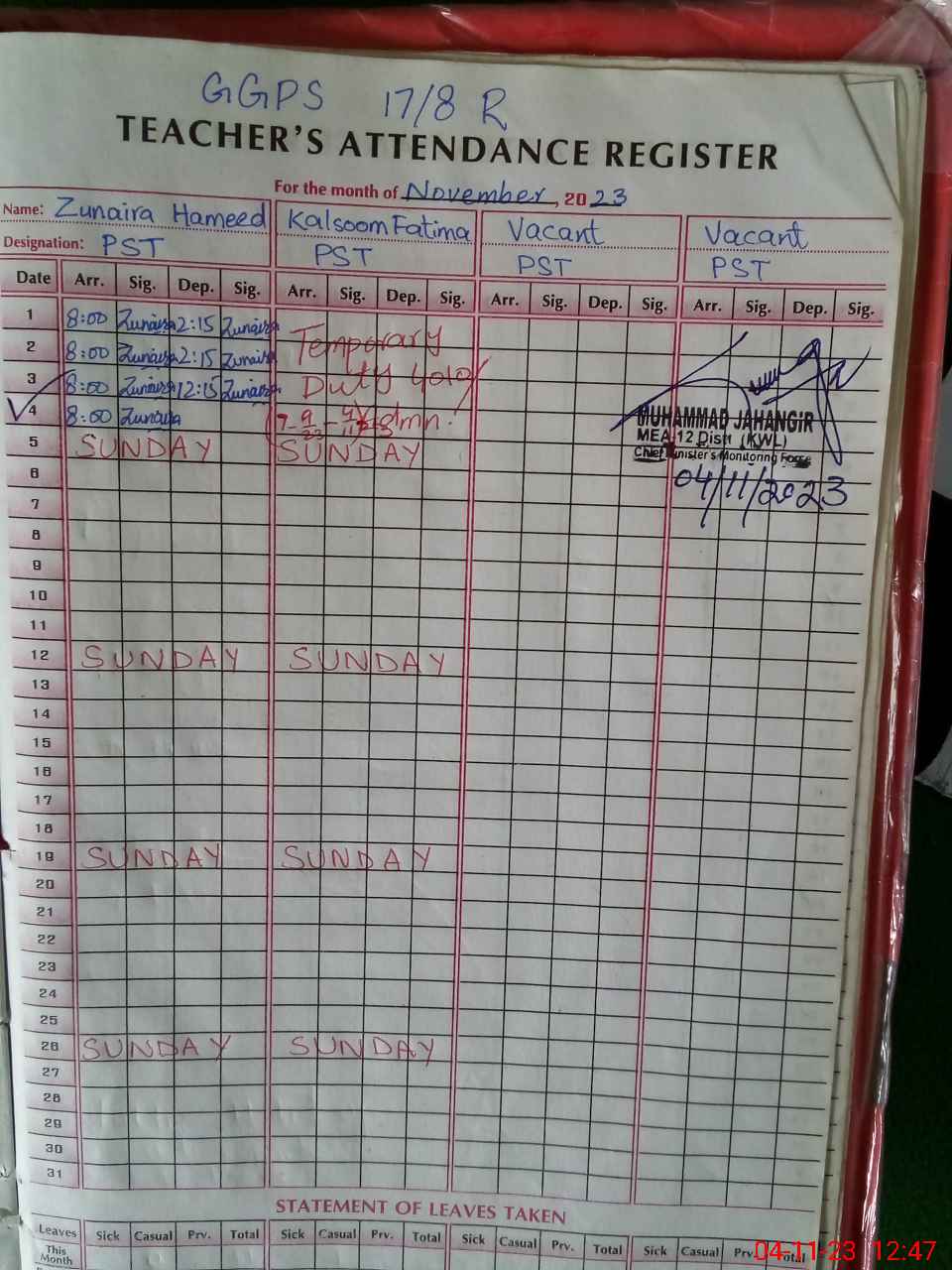 | Remarks (Use Separate Page if Required): THIS SCHOOL IS INSAF AFTERNOON SCHOOL FTF RECORDS IS NOT MAINTAINED BANK STATEMENTS ARE NOT AVAILABLE KALSOOM FATIMA PST IS ON TEMPORARY DUTY NEED BASE OR TILL THE COMPLETION OF ASSIGNMENT FROM 07 SEPTEMBER 2023 TO 04 NOVEMBER 2023 TWO TOILETS FOUND BLOCKED AND NON FUNCTIONAL AND ONE TOILET MOTOR PUMP IS FITTED THAT IS DANGEROUS AND NON FUNCTIONAL RANDOM CLASS ONE IS NOW IN CLASS THREE | |||||