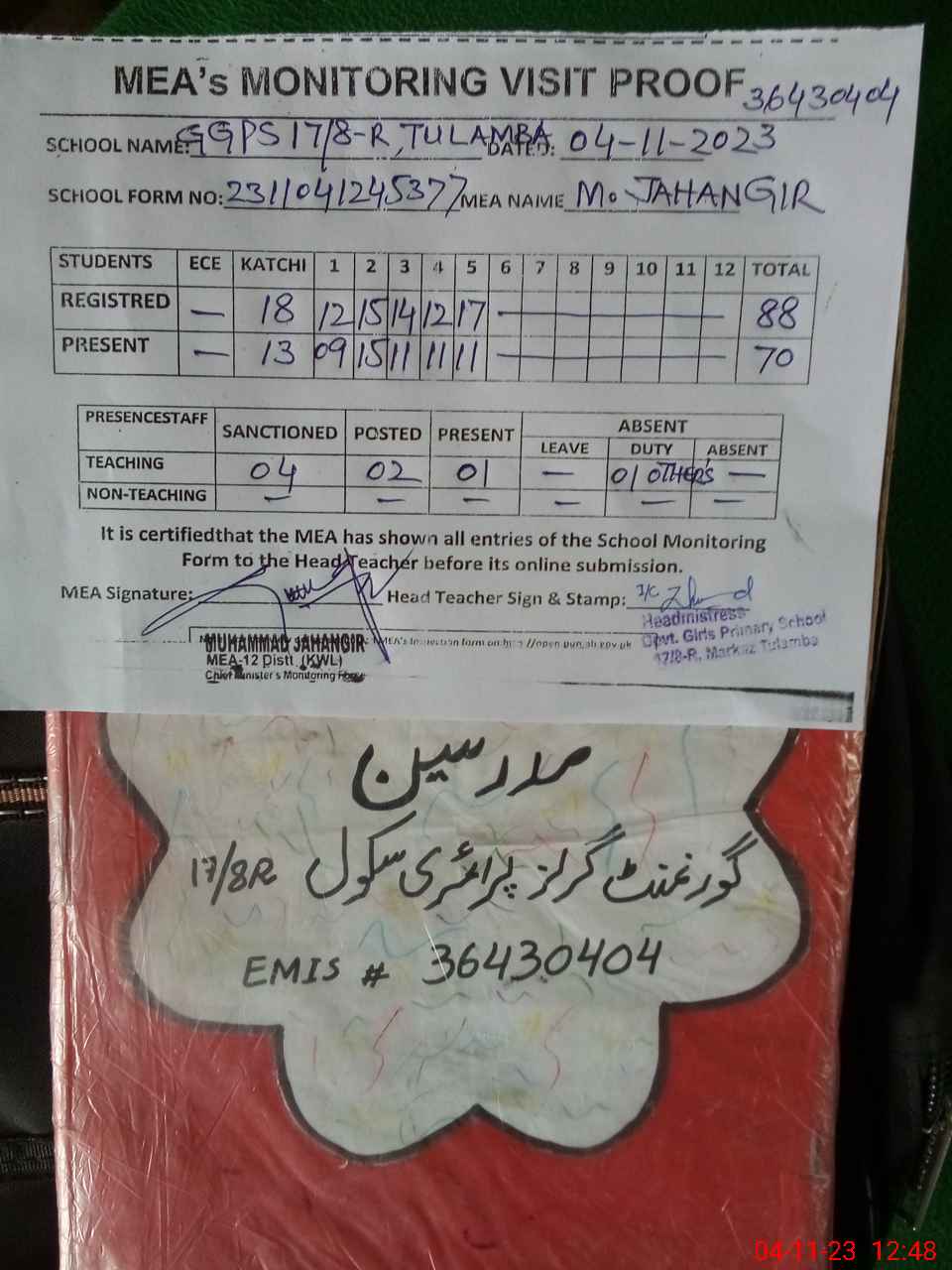 | EMIS Code: 36430404 | Name of School: GGPS 17/8-R, TULAMBA | |||
