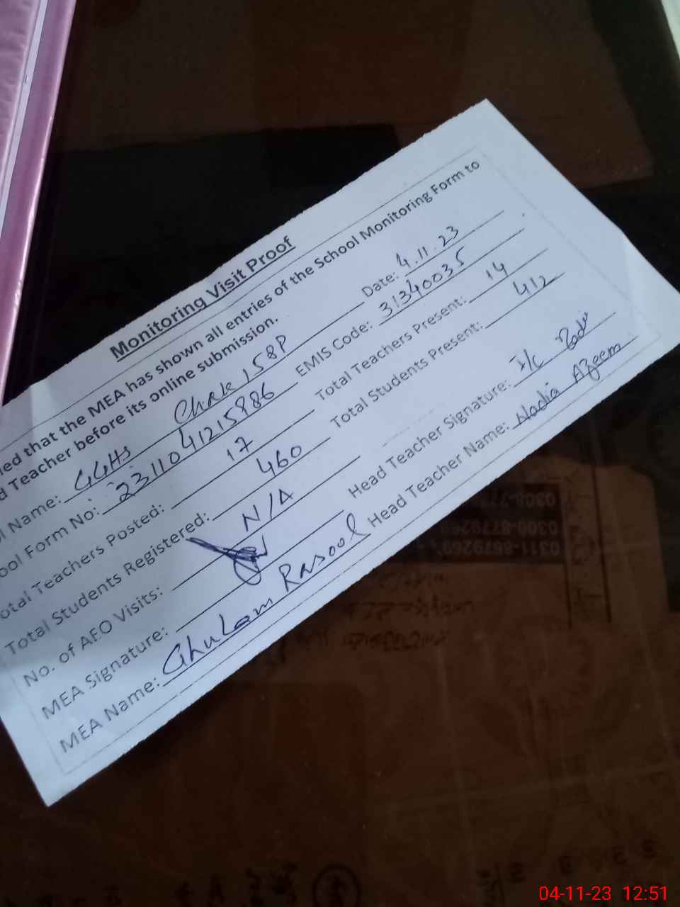 | Attendance Register | Head Teacher | MEA with School | Visit Proof |