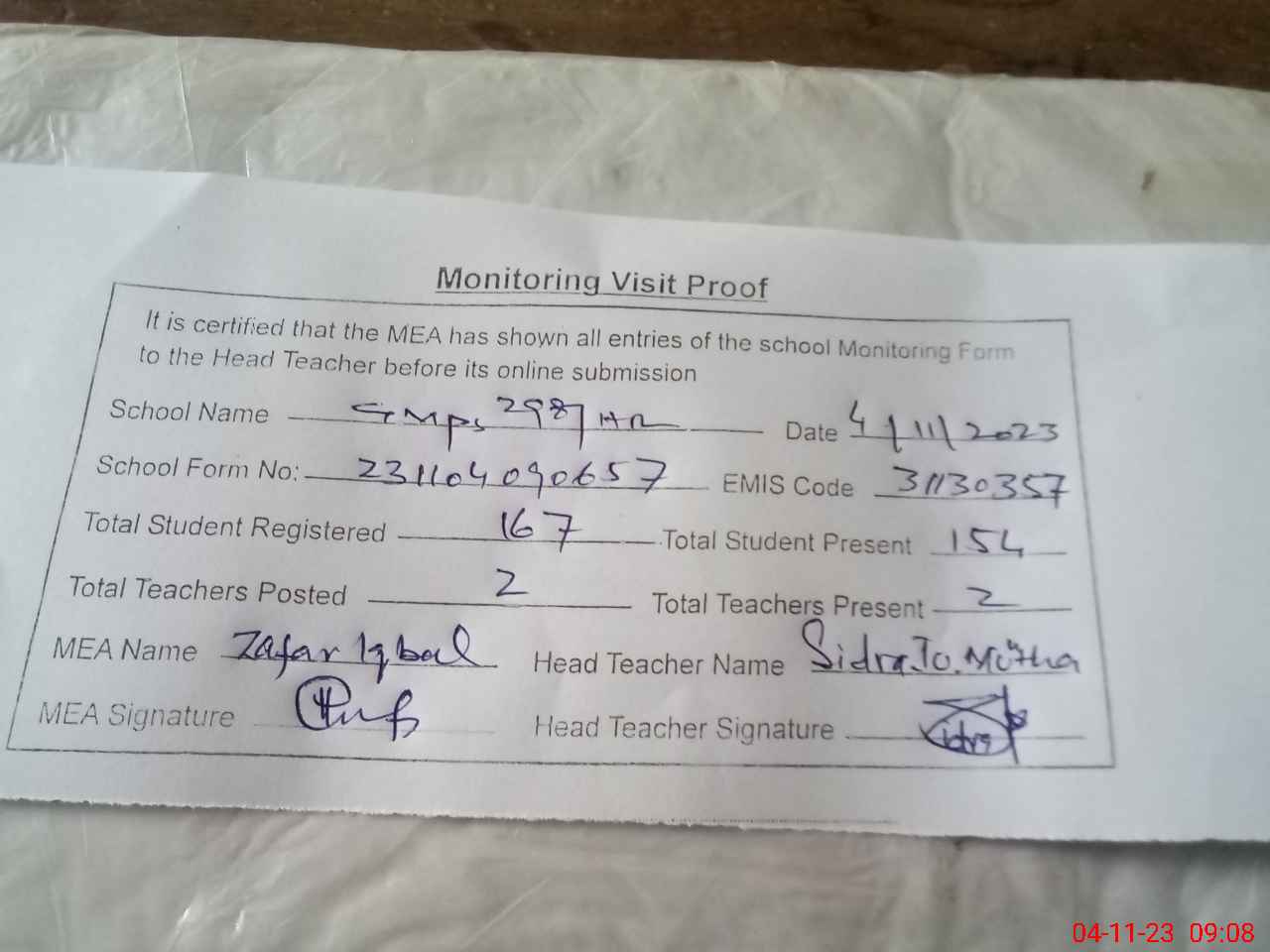 | Attendance Register | Head Teacher | MEA with School | Visit Proof |