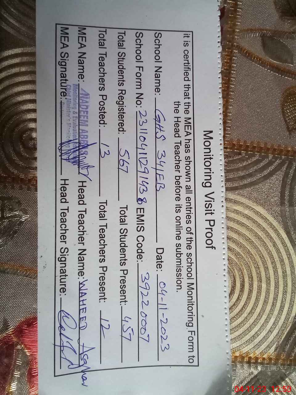 | Attendance Register | Head Teacher | MEA with School | Visit Proof |