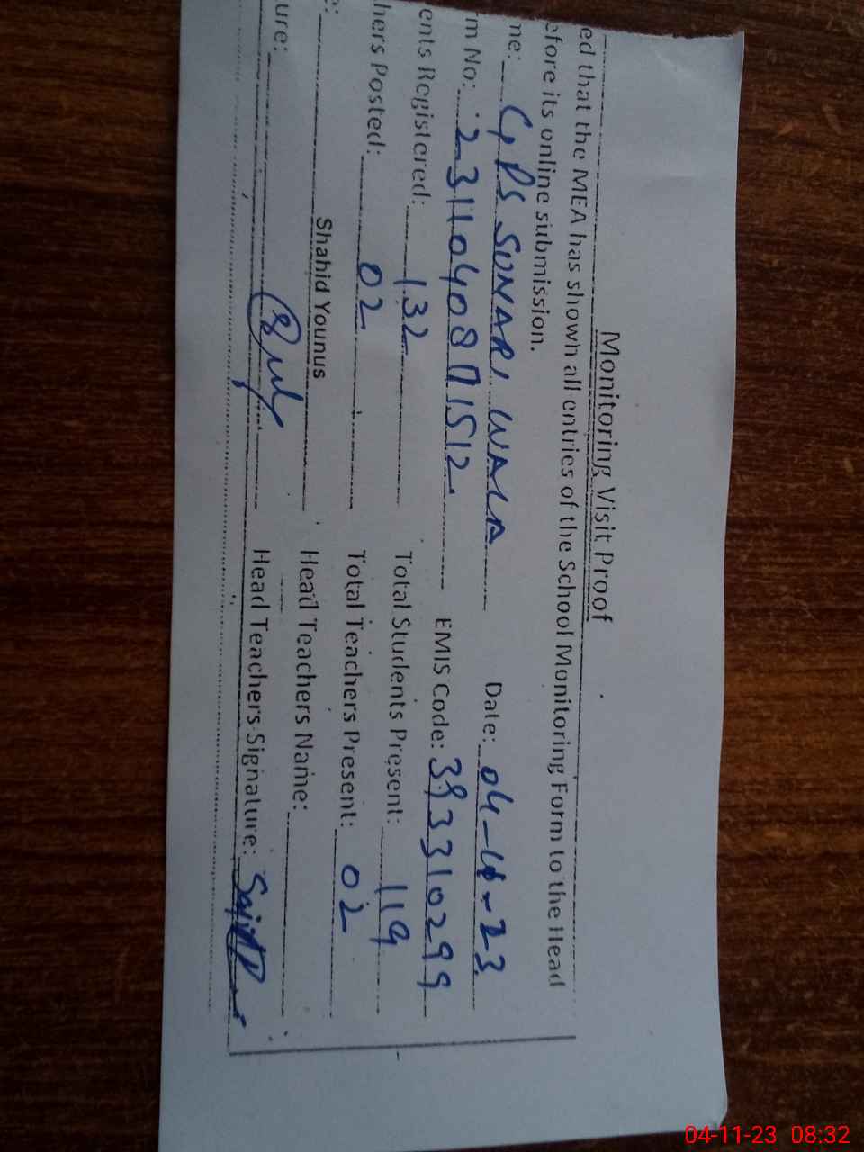 | Attendance Register | Head Teacher | MEA with School | Visit Proof |