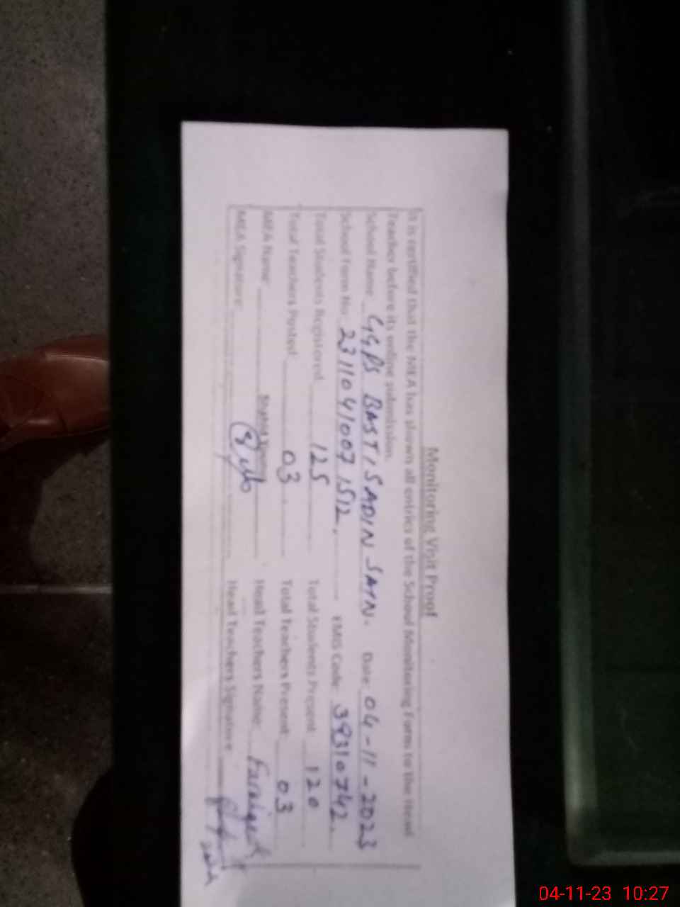 | Attendance Register | Head Teacher | MEA with School | Visit Proof |