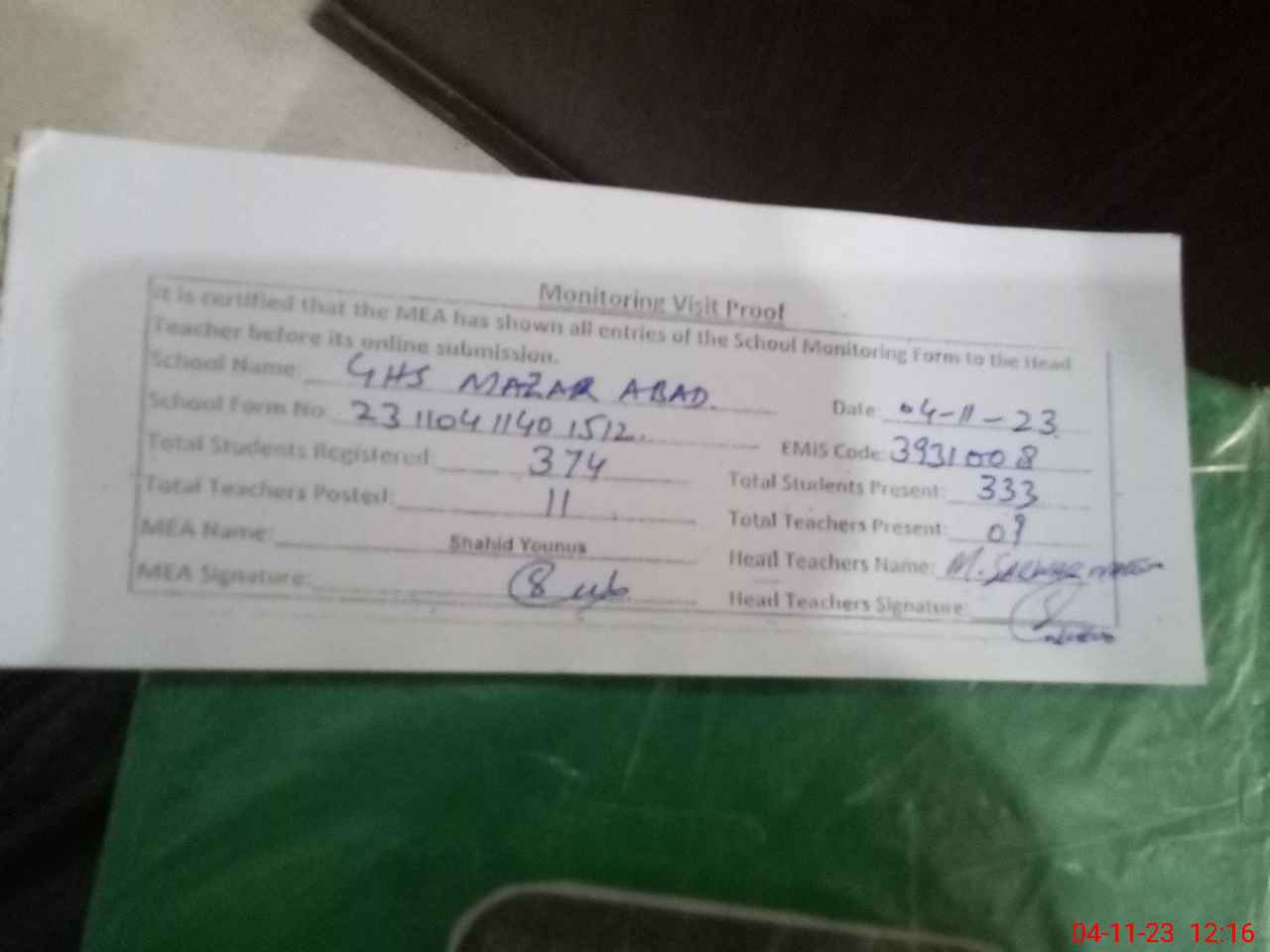| Attendance Register | Head Teacher | MEA with School | Visit Proof |