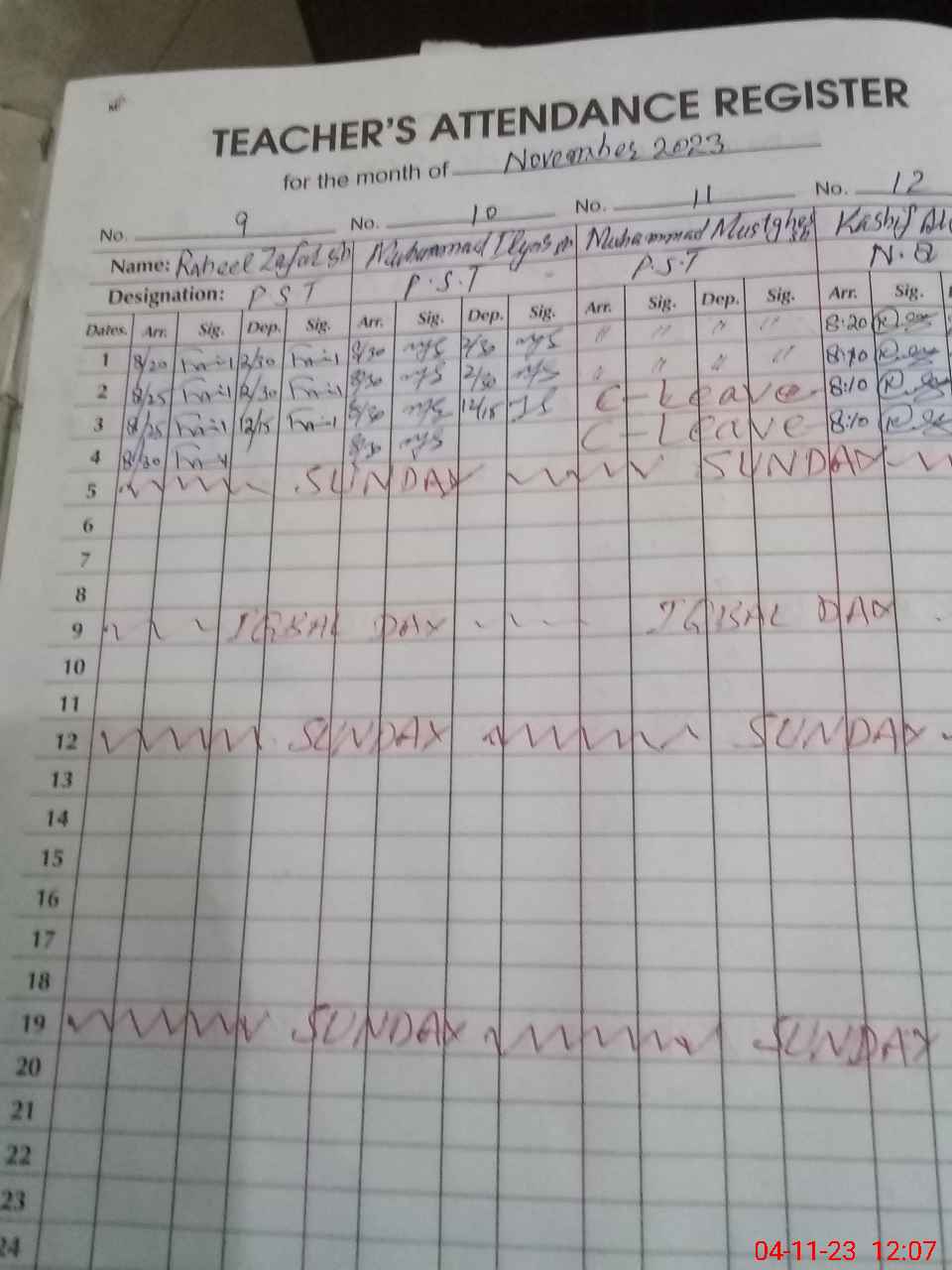 | CNIC | Full Name | Designation | R/C | Absence During Last Calender Month |
