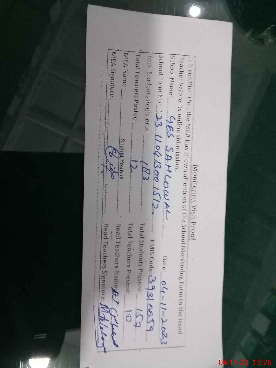 | Attendance Register | Head Teacher | MEA with School | Visit Proof |
