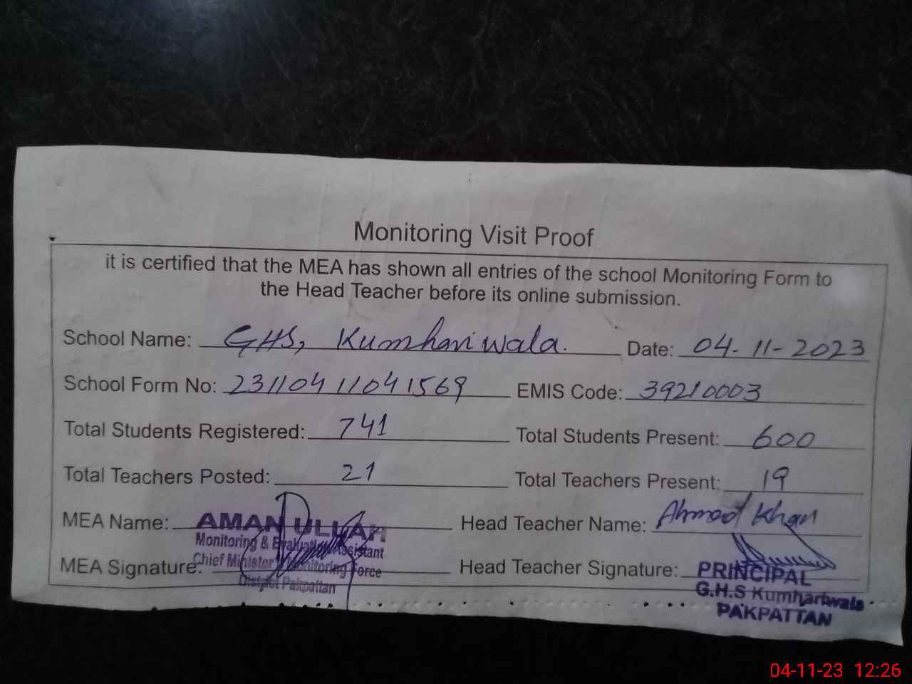 | Attendance Register | Head Teacher | MEA with School | Visit Proof |