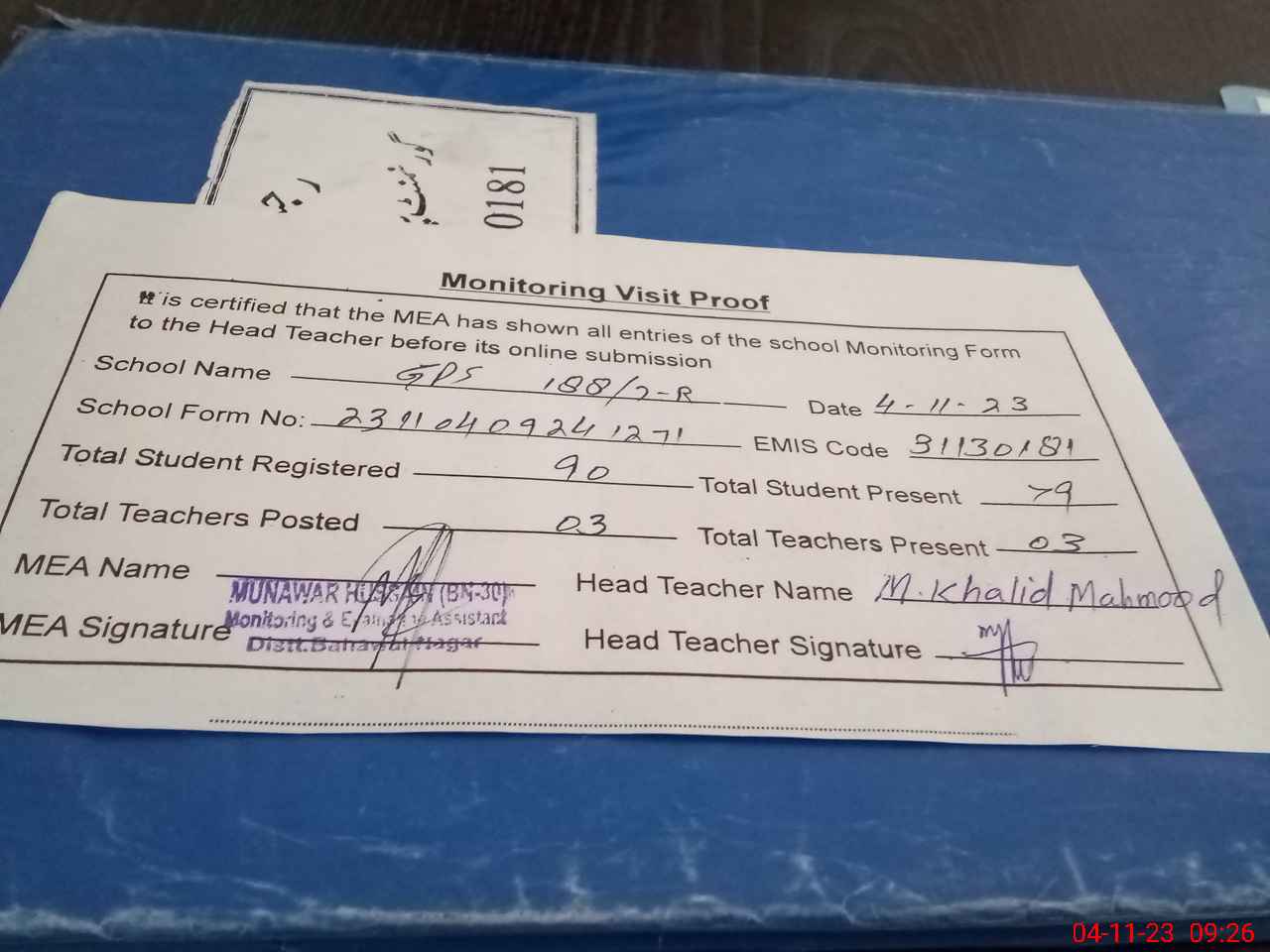 | Attendance Register | Head Teacher | MEA with School | Visit Proof |