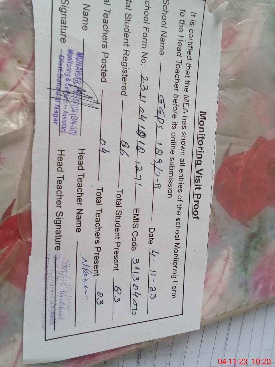 | Attendance Register | Head Teacher | MEA with School | Visit Proof |