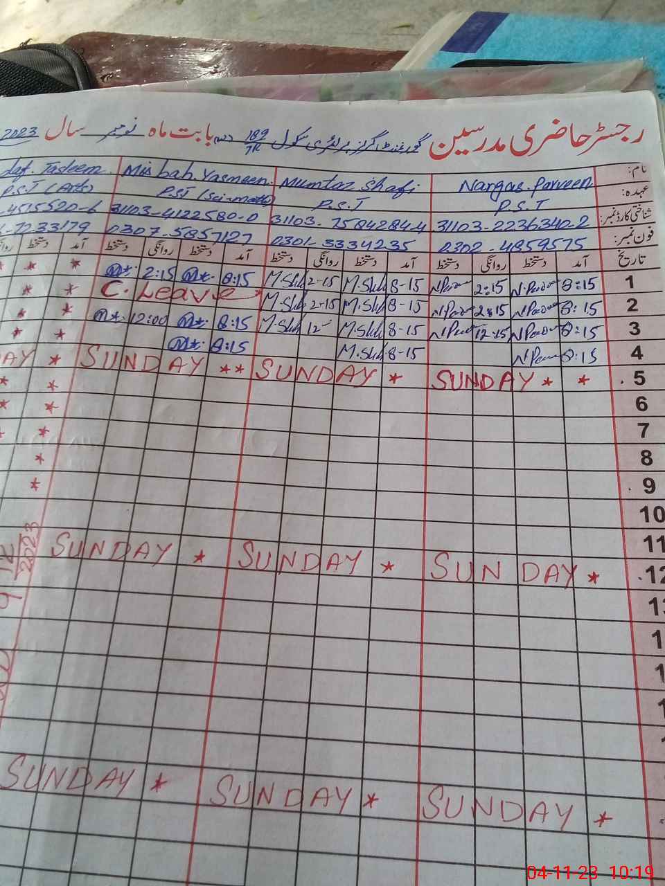 | CNIC | Full Name | Designation | R/C | Absence During Last Calender Month |