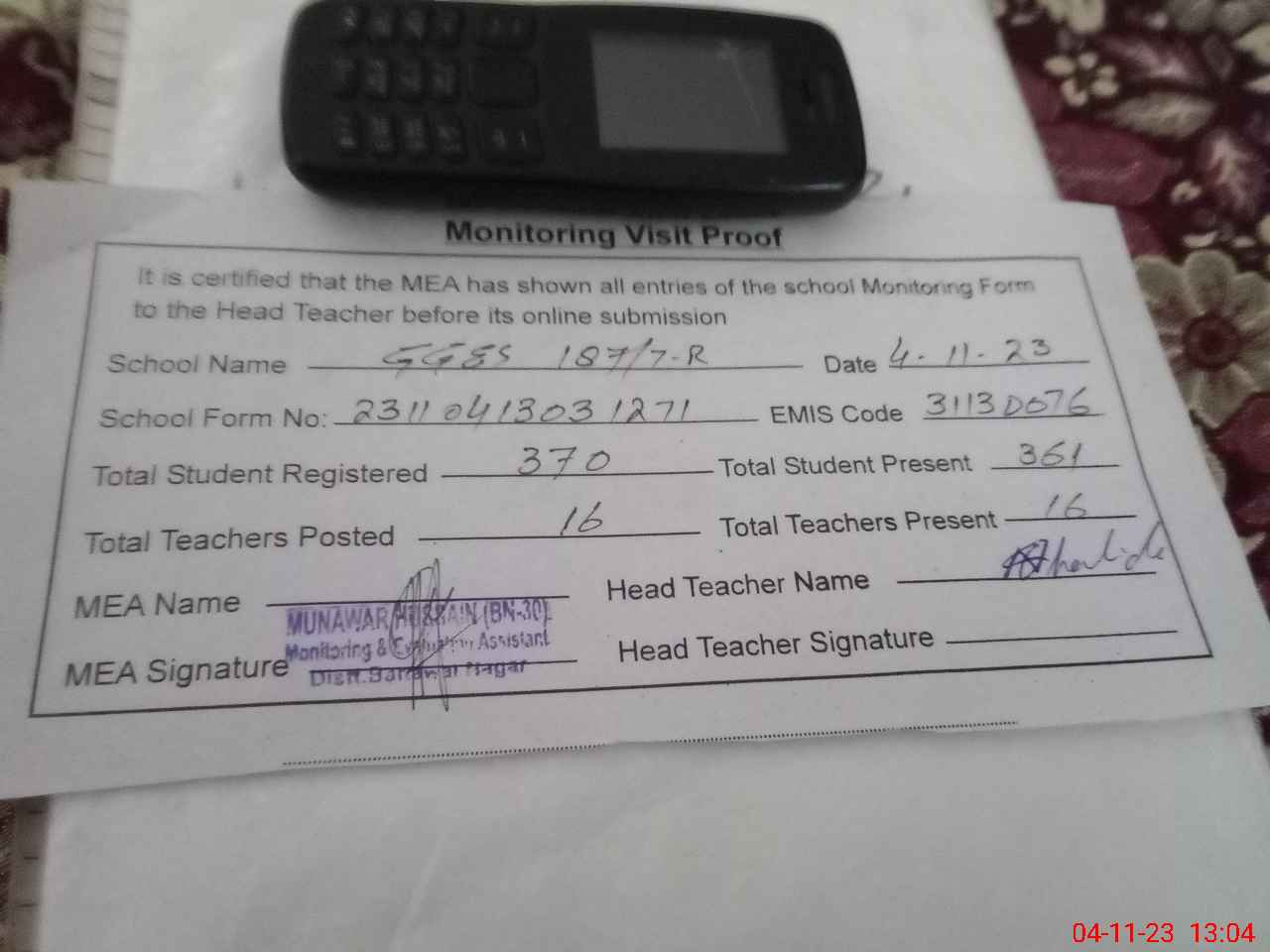 | Attendance Register | Head Teacher | MEA with School | Visit Proof |