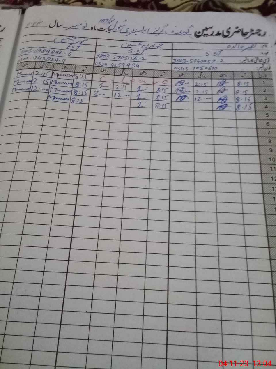 | CNIC | Full Name | Designation | R/C | Absence During Last Calender Month |