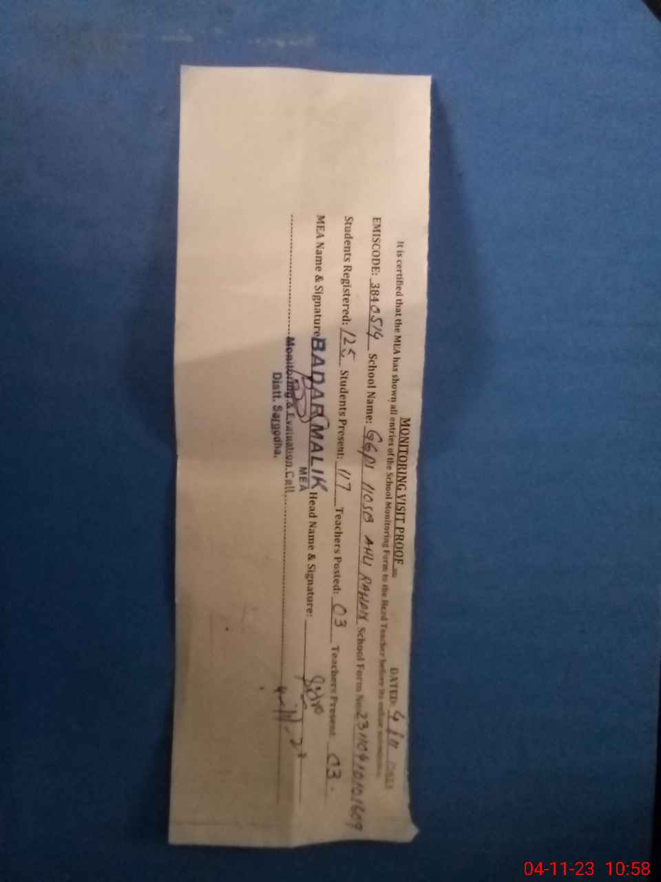 | Attendance Register | Head Teacher | MEA with School | Visit Proof |