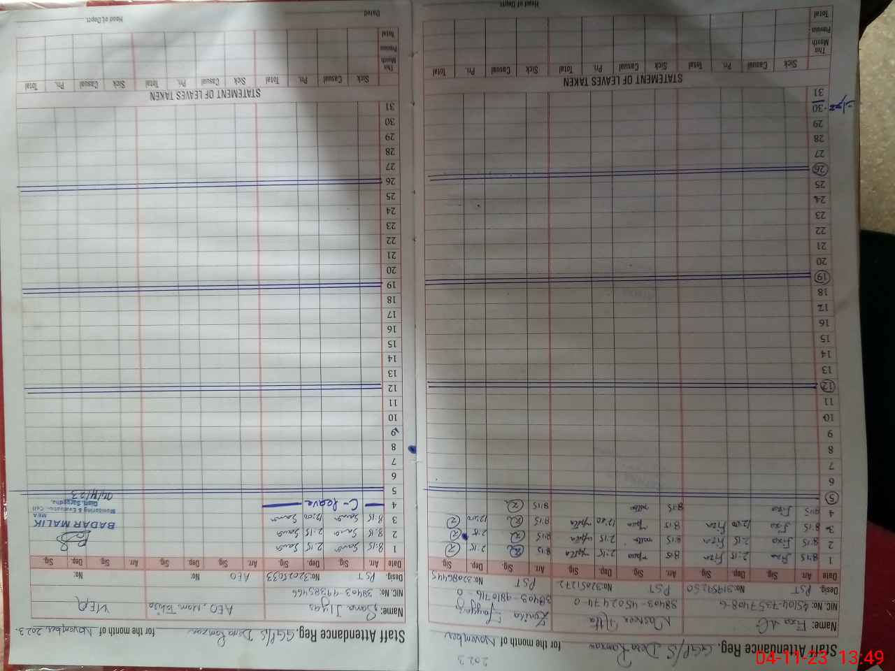 | CNIC | Full Name | Designation | R/C | Absence during last cal. month |