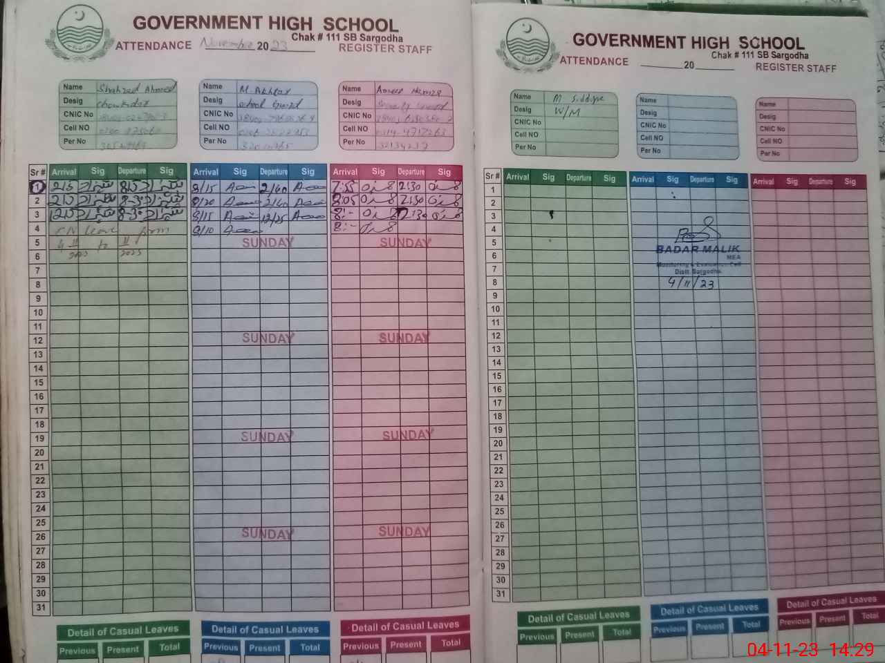 | CNIC | Full Name | Designation | R/C | Absence During Last Calender Month |