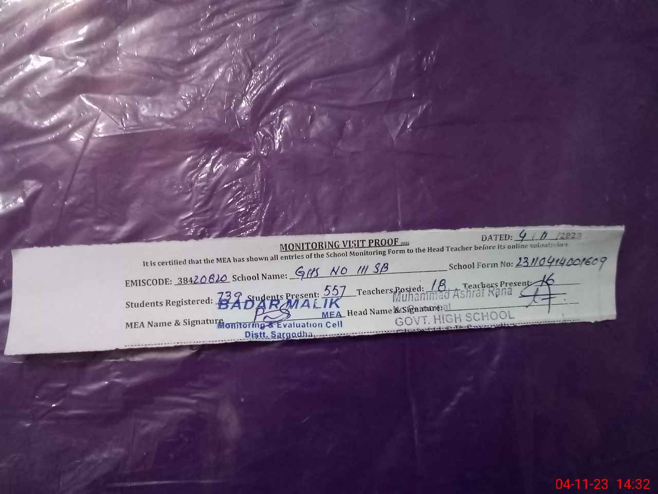 | Attendance Register | Head Teacher | MEA with School | Visit Proof |