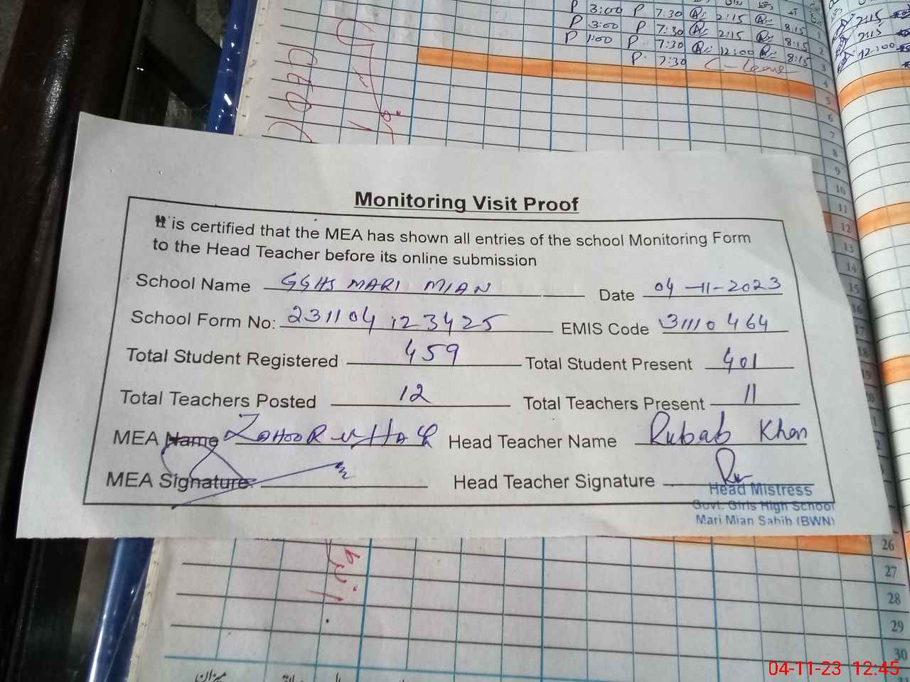 | Attendance Register | Head Teacher | MEA with School | Visit Proof |