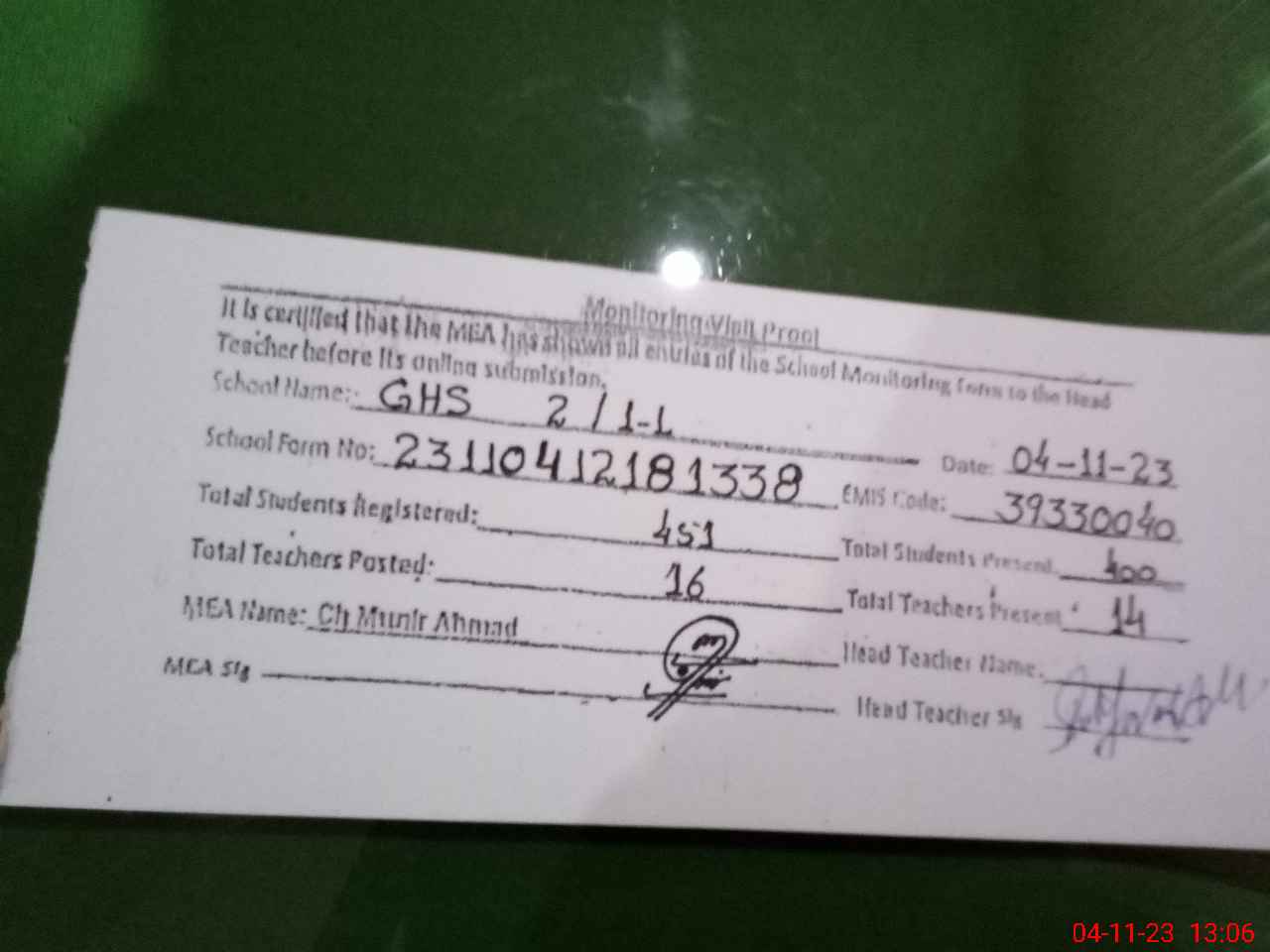 | Attendance Register | Head Teacher | MEA with School | Visit Proof |
