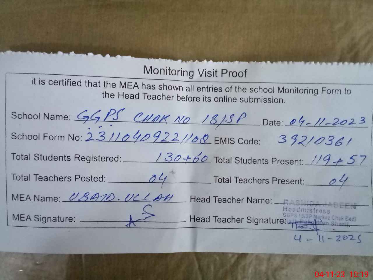 | EMIS Code: 39210361 | Name of School: GGPS CHAK 18 SP | |||