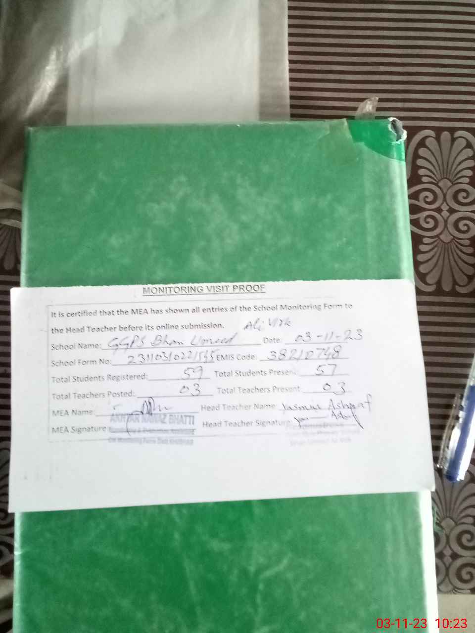 | EMIS Code: 38210748 | Name of School: GGPS BHAN UMEED ALI VIRK | |||