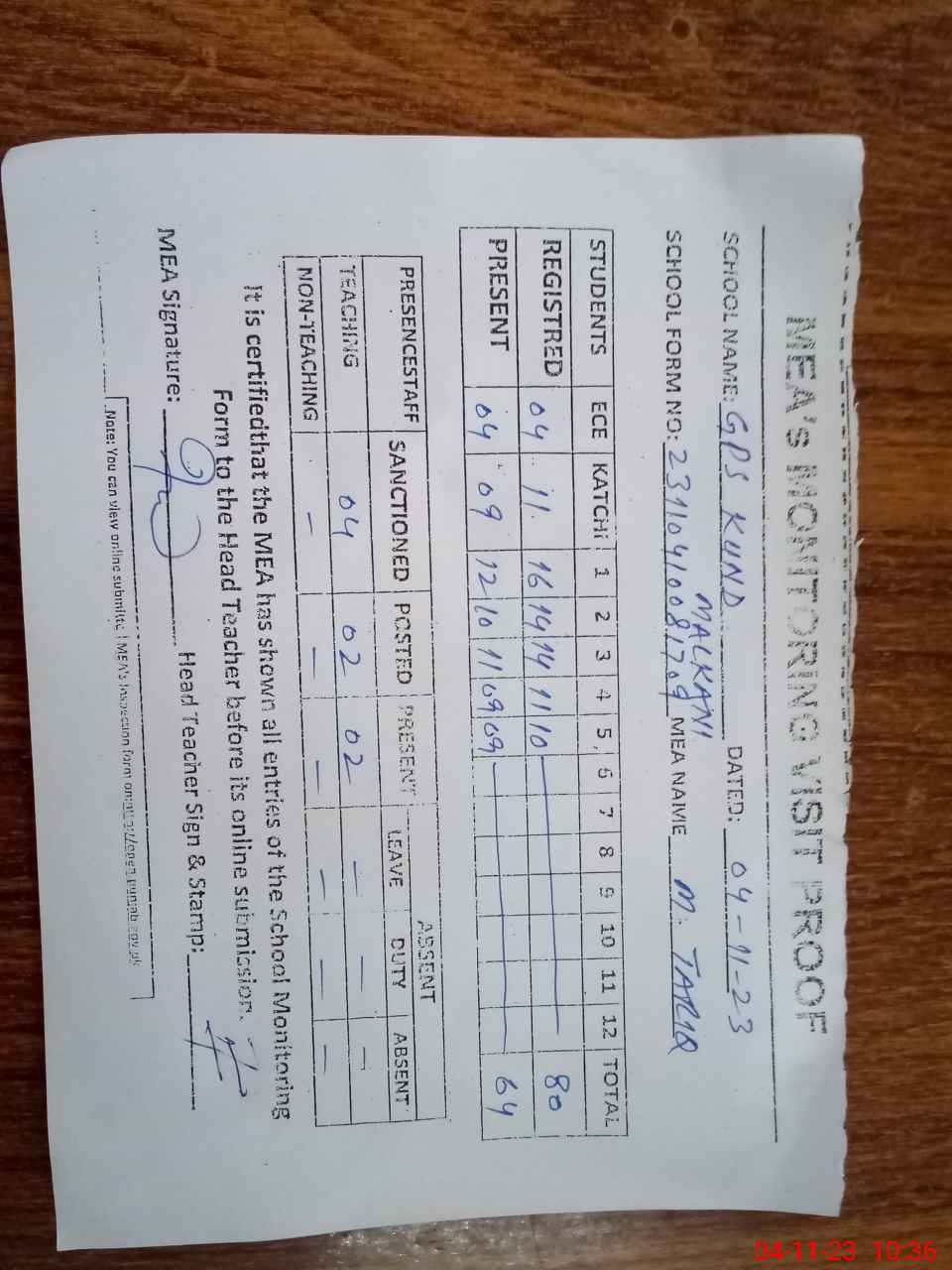 | Attendance Register | Head Teacher | MEA with School | Visit Proof |