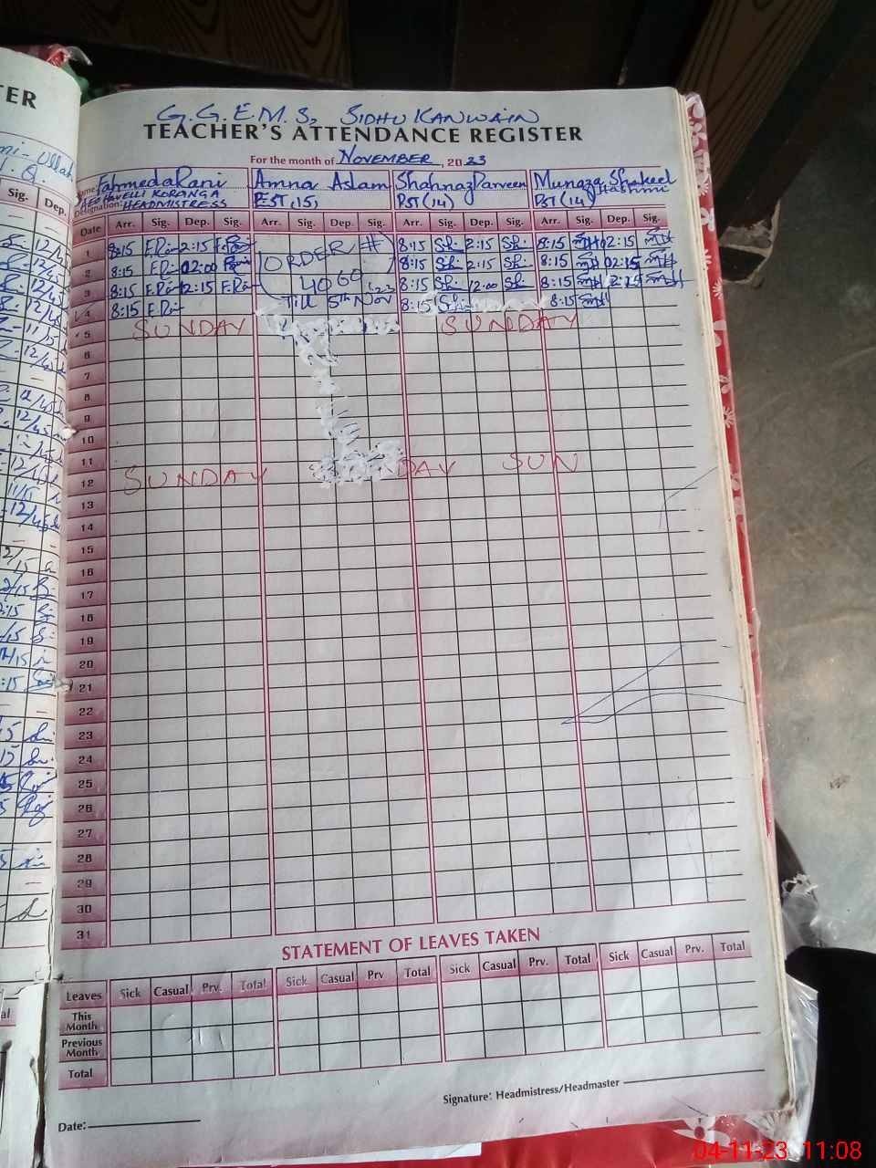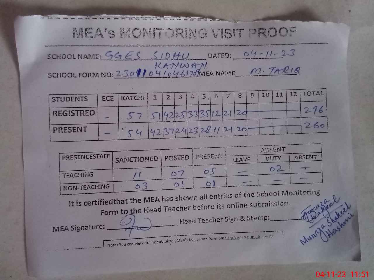 | Attendance Register | Head Teacher | MEA with School | Visit Proof |