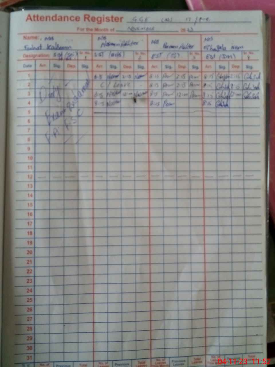 | 36**** | Fa**** Ku**** | 5 | 1 | 0 | 0 | 0 | 0 | 0 | 0 | 0 | 0 | 0 | Exam Duty |