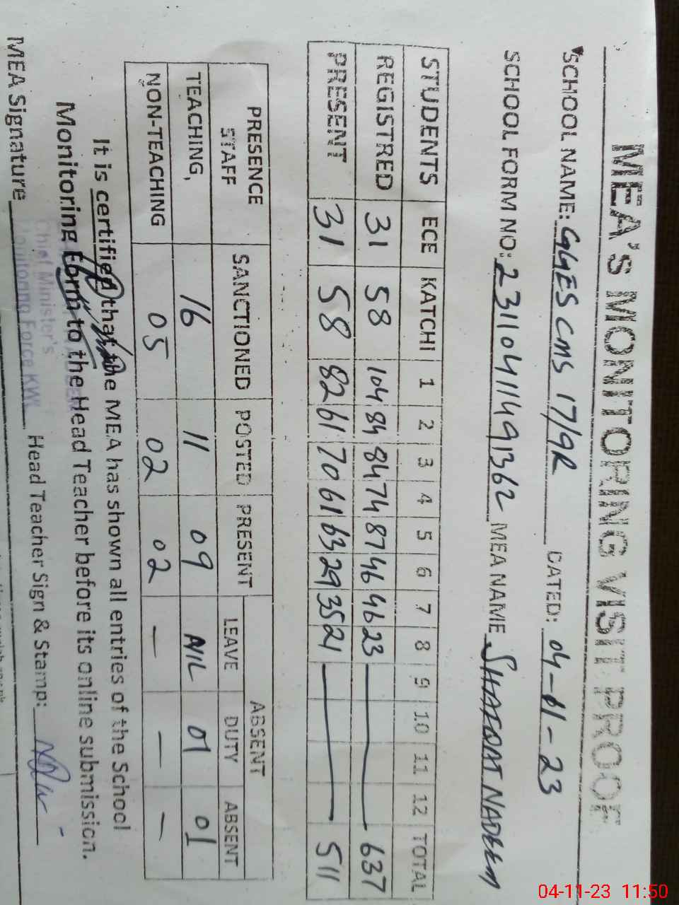 | Attendance Register | Head Teacher | MEA with School | Visit Proof |