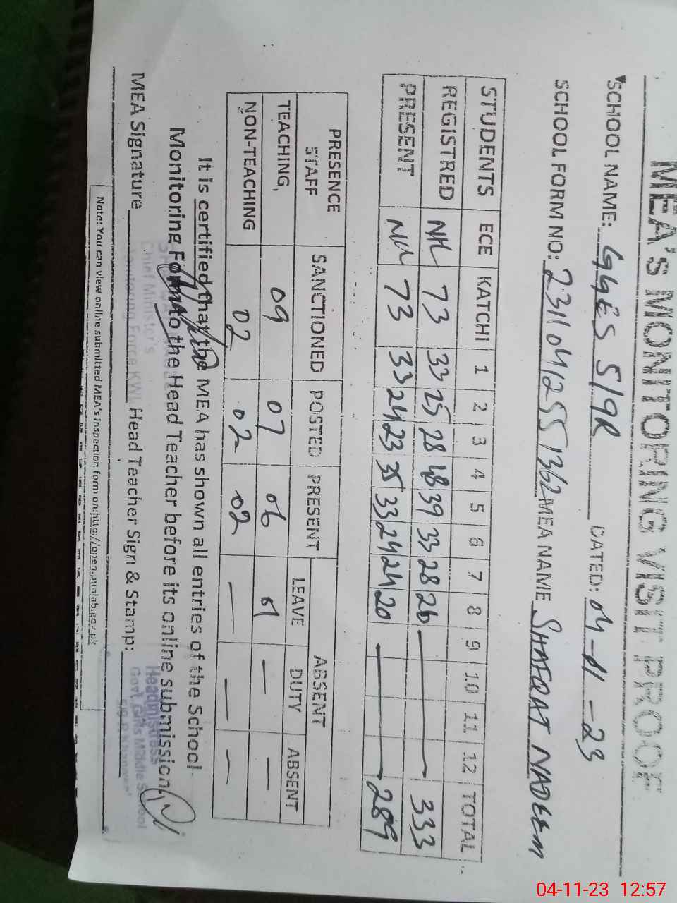 | Attendance Register | Head Teacher | MEA with School | Visit Proof |