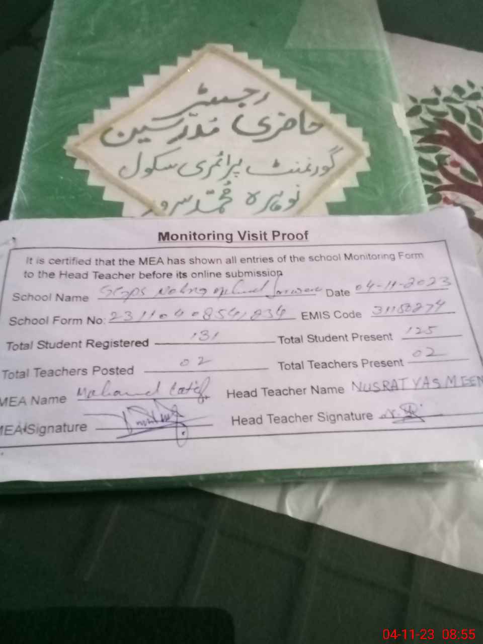 | Attendance Register | Head Teacher | MEA with School | Visit Proof |
