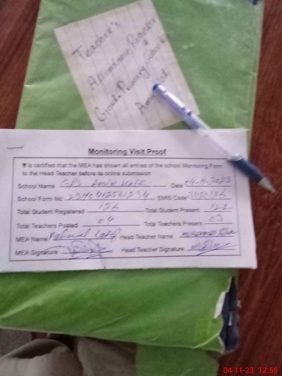 | Attendance Register | Head Teacher | MEA with School | Visit Proof |