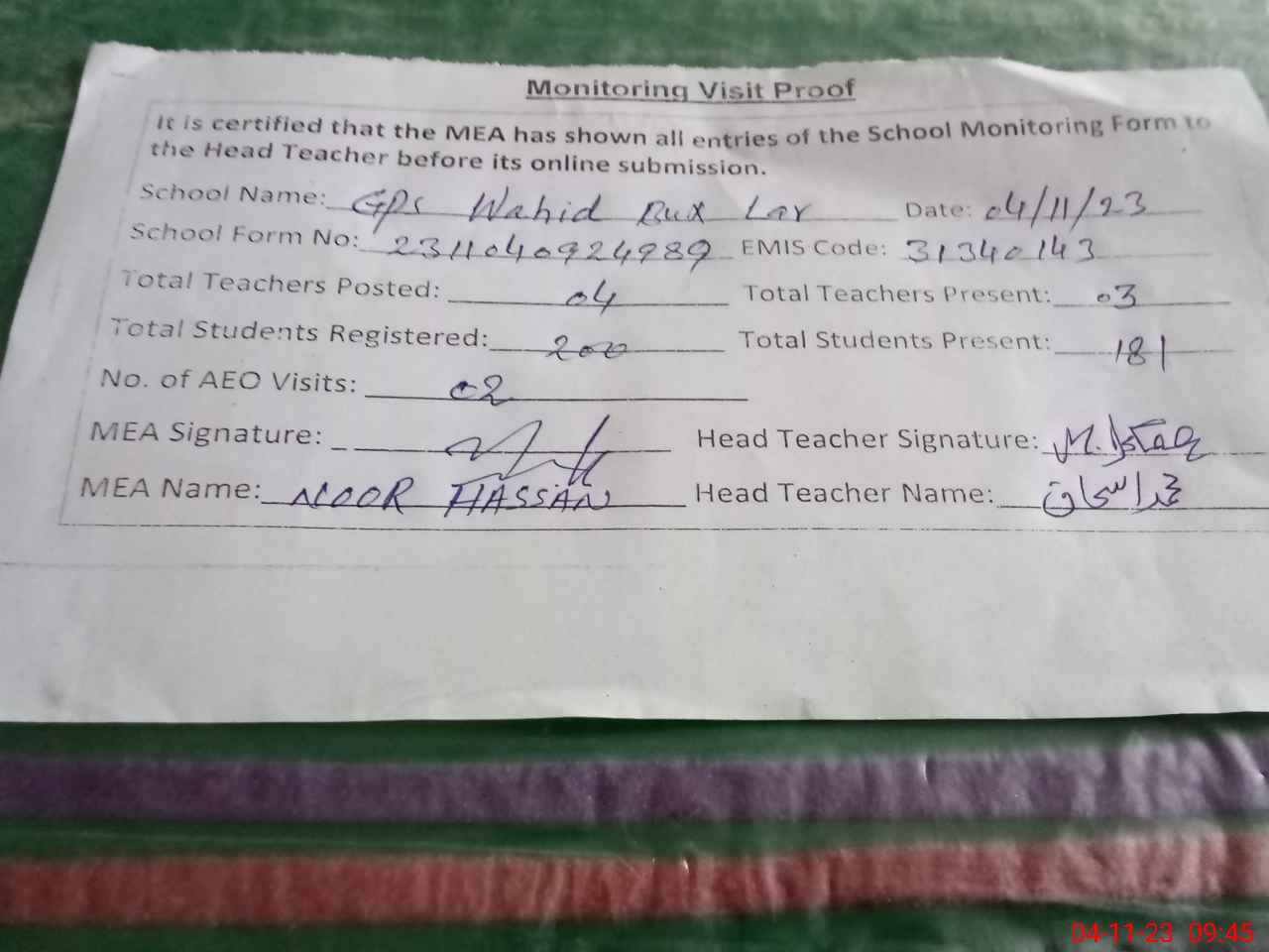 | Attendance Register | Head Teacher | MEA with School | Visit Proof |