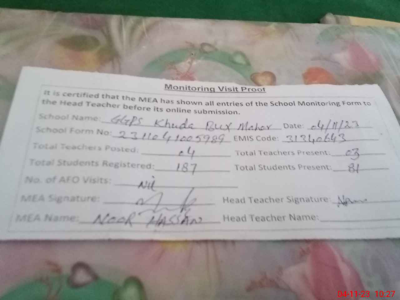 | Attendance Register | Head Teacher | MEA with School | Visit Proof |