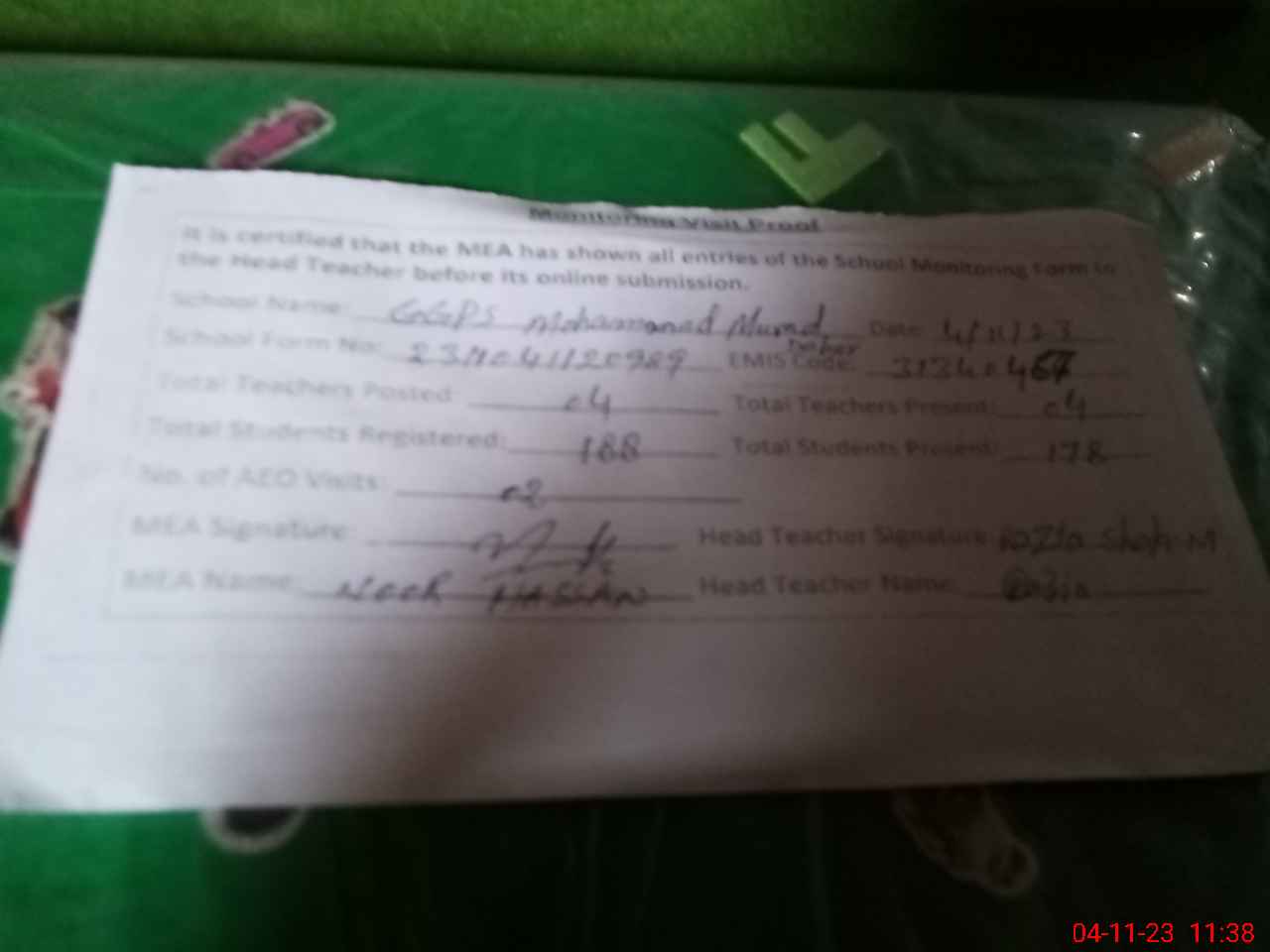 | Attendance Register | Head Teacher | MEA with School | Visit Proof |