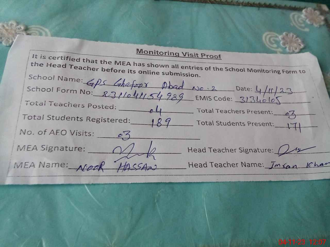 | Attendance Register | Head Teacher | MEA with School | Visit Proof |