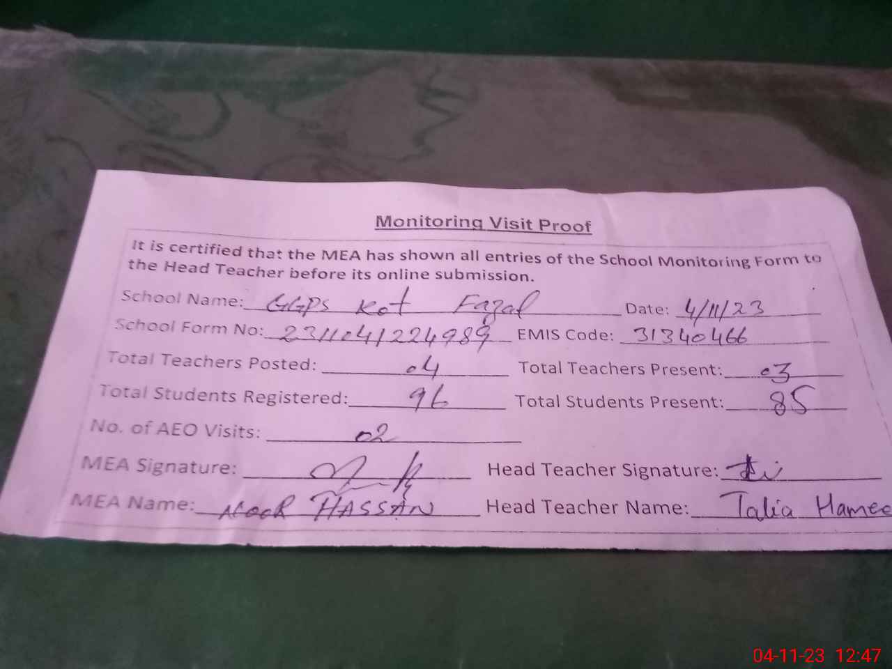 | Attendance Register | Head Teacher | MEA with School | Visit Proof |