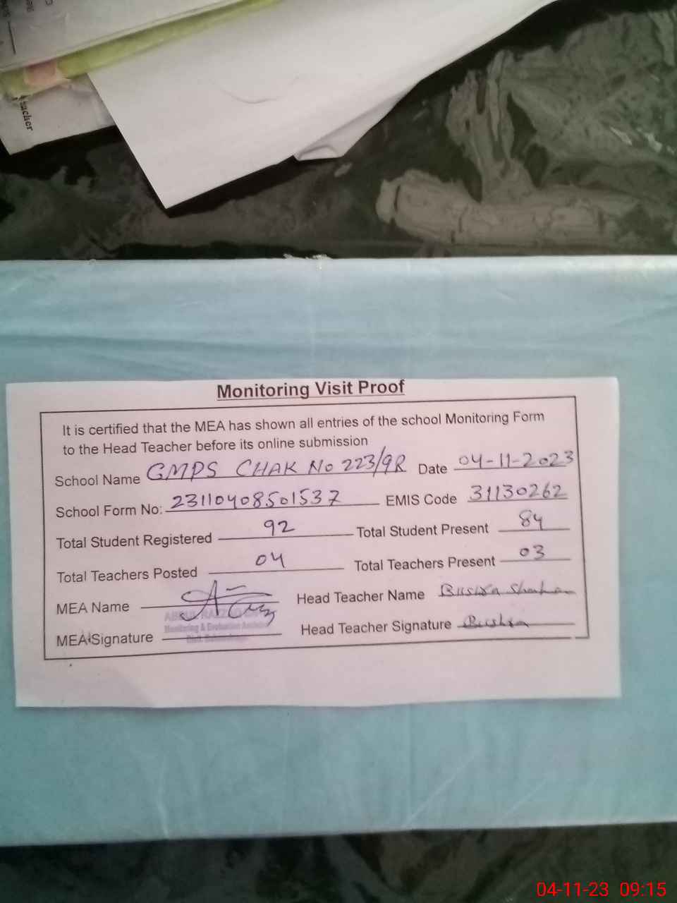| EMIS Code: 31130262 | Name of School: GMPS CHAK NO 223/9-R | |||