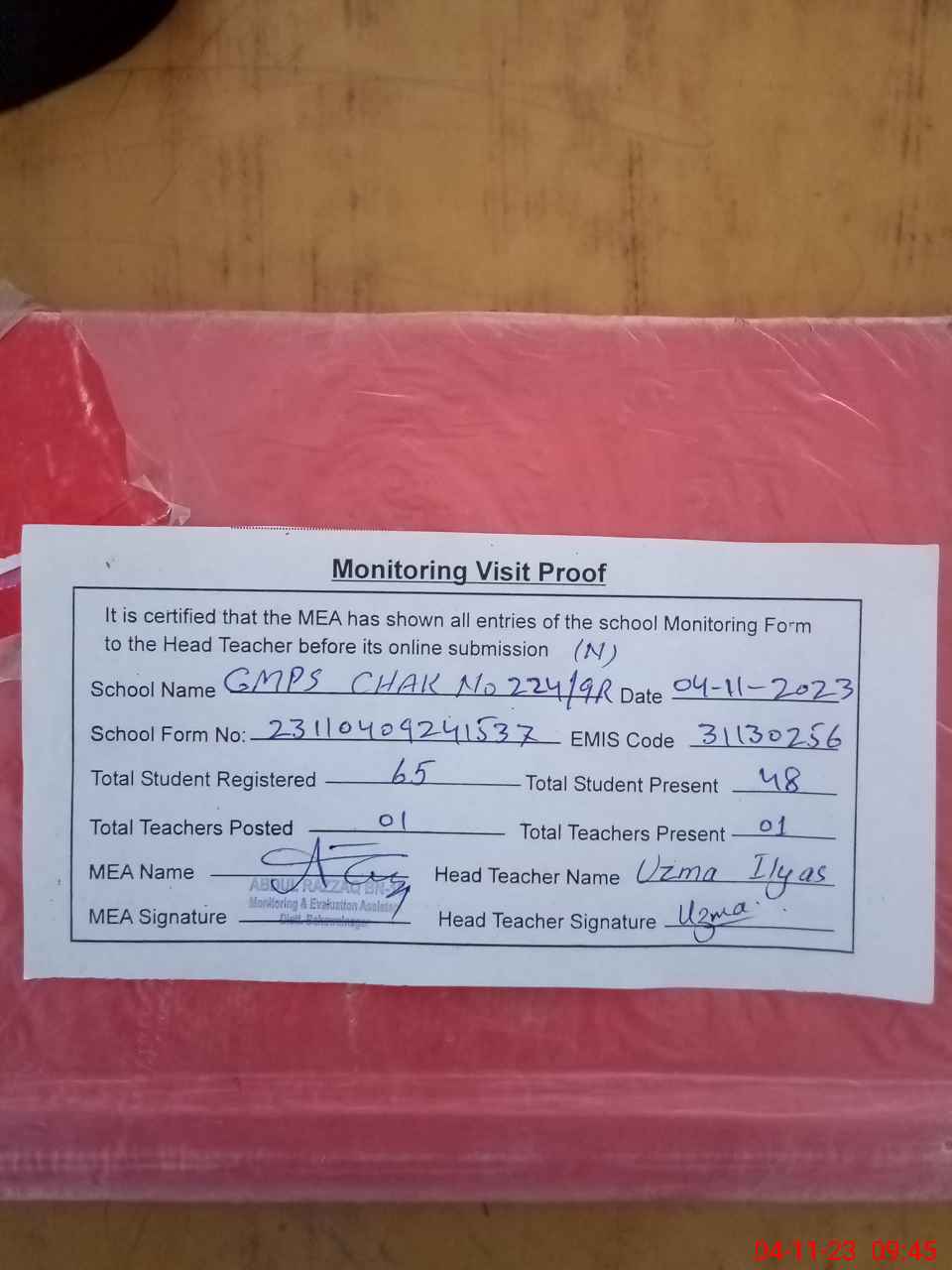 | EMIS Code: 31130256 | Name of School: GMPS CHAK NO 224/9-R N | |||