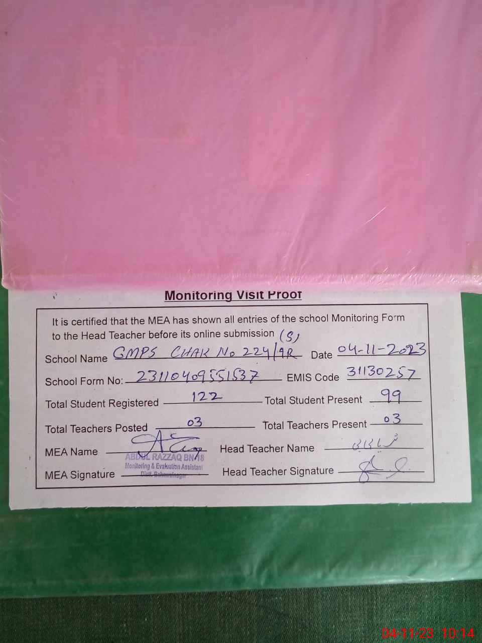 | EMIS Code: 31130257 | Name of School: GGPS CHAK NO 224/9-R (S) | |||