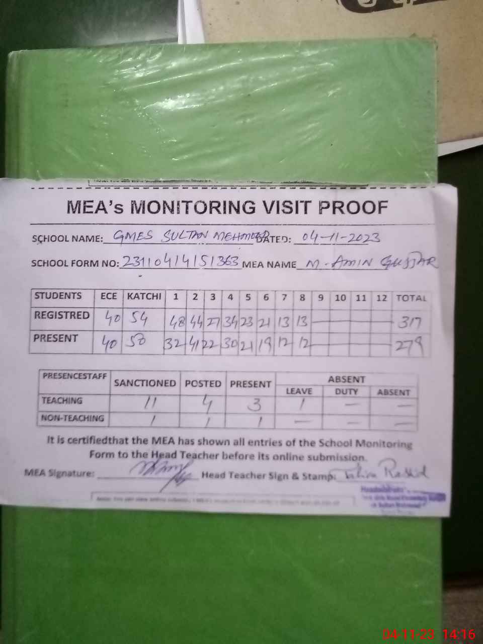 | Attendance Register | Head Teacher | MEA with School | Visit Proof |