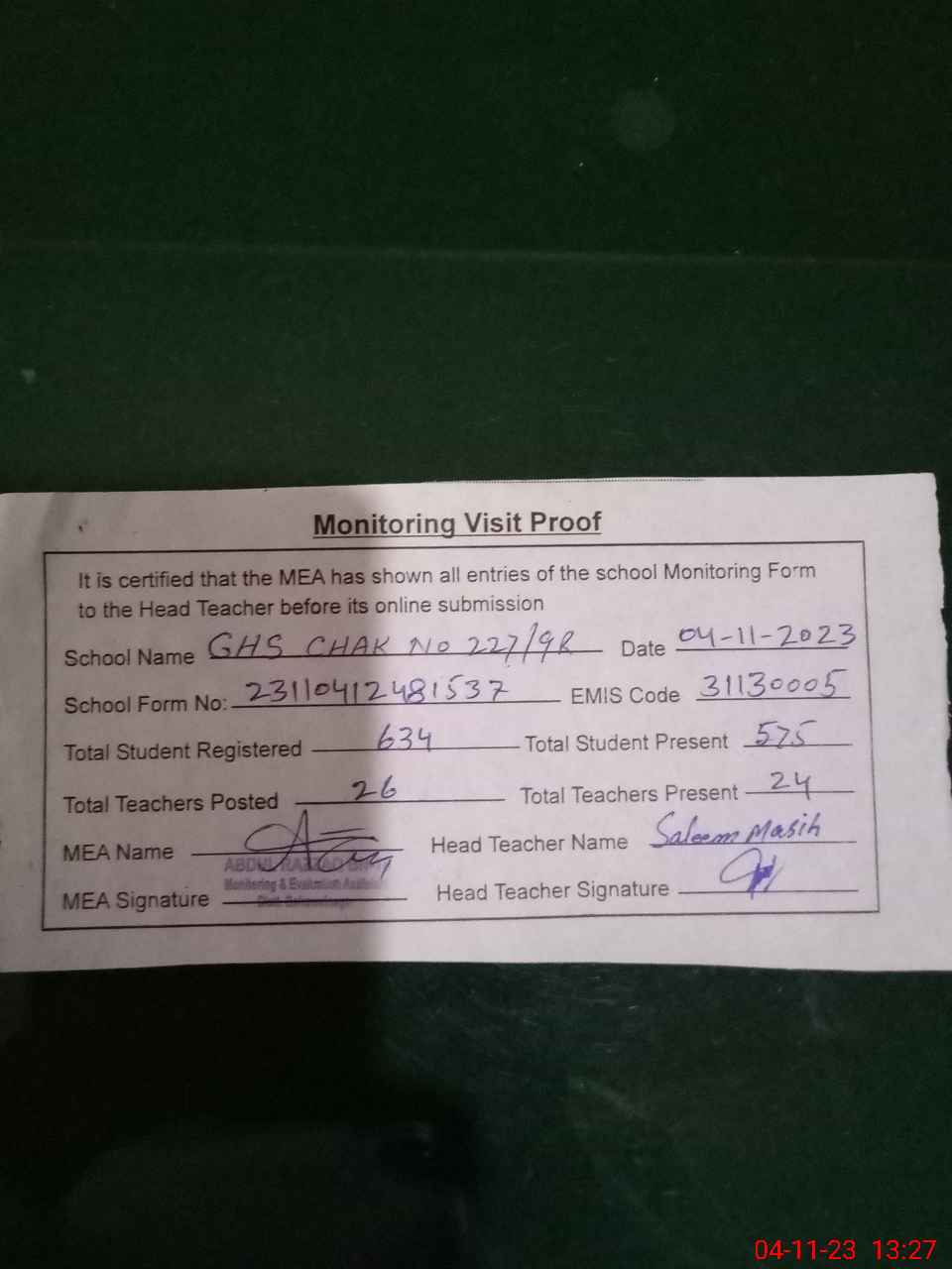 | EMIS Code: 31130005 | Name of School: GHS CHAK 227/9-R | |||
