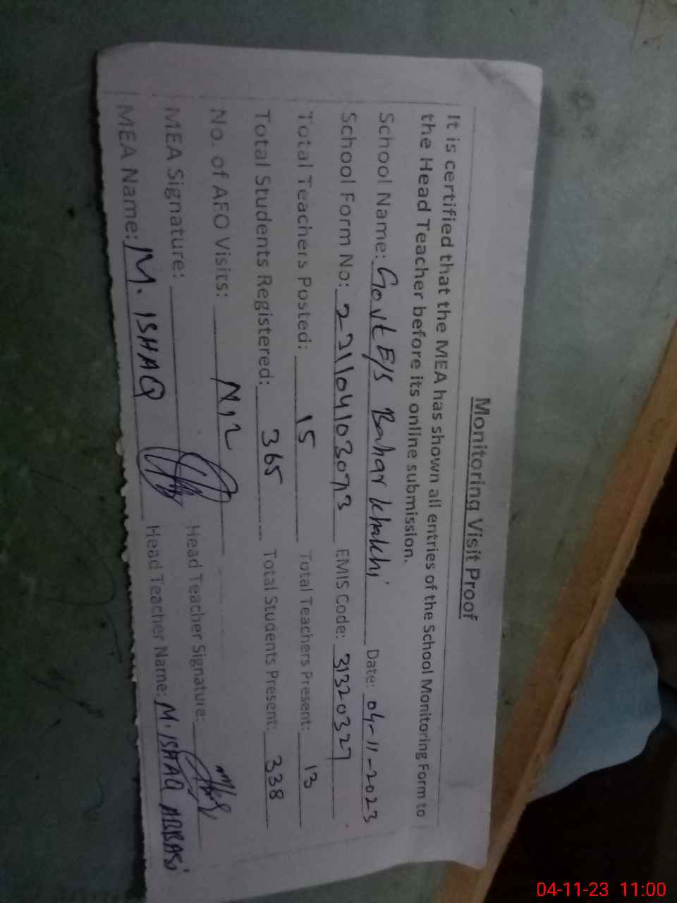 | Attendance Register | Head Teacher | MEA with School | Visit Proof |