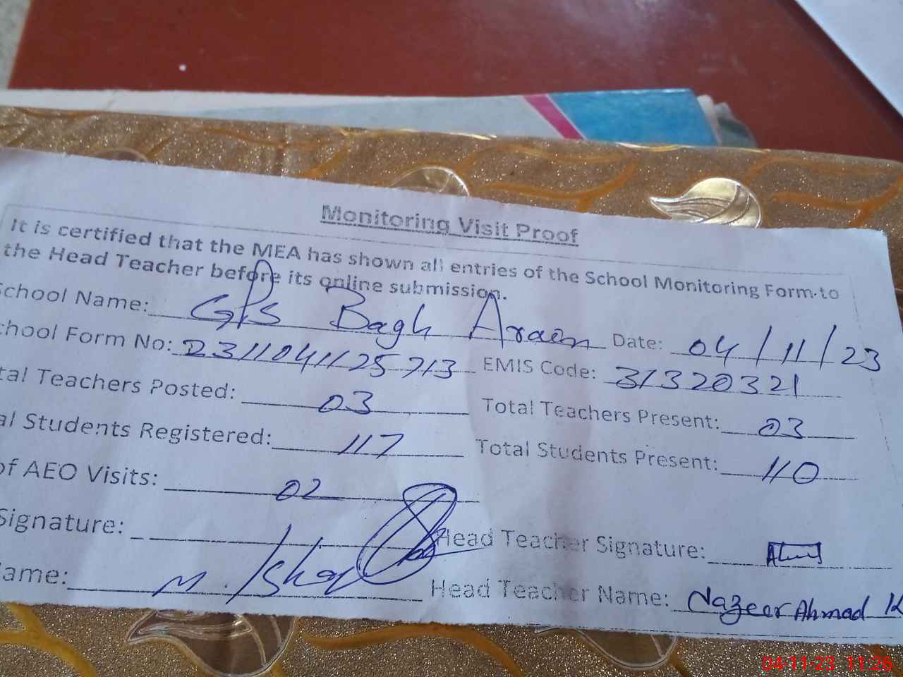 | Attendance Register | Head Teacher | MEA with School | Visit Proof |