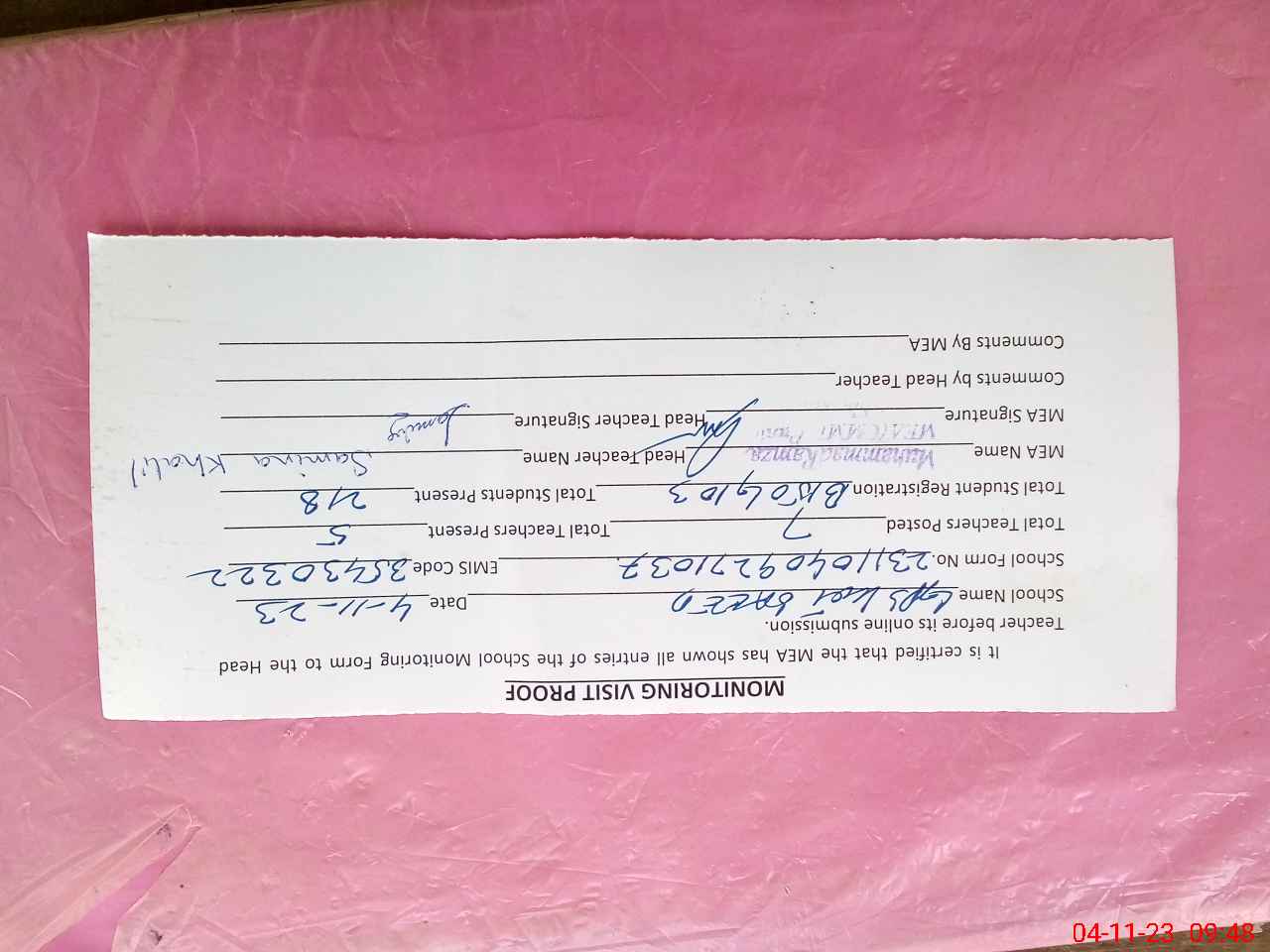 | Attendance Register | Head Teacher | MEA with School | Visit Proof |
