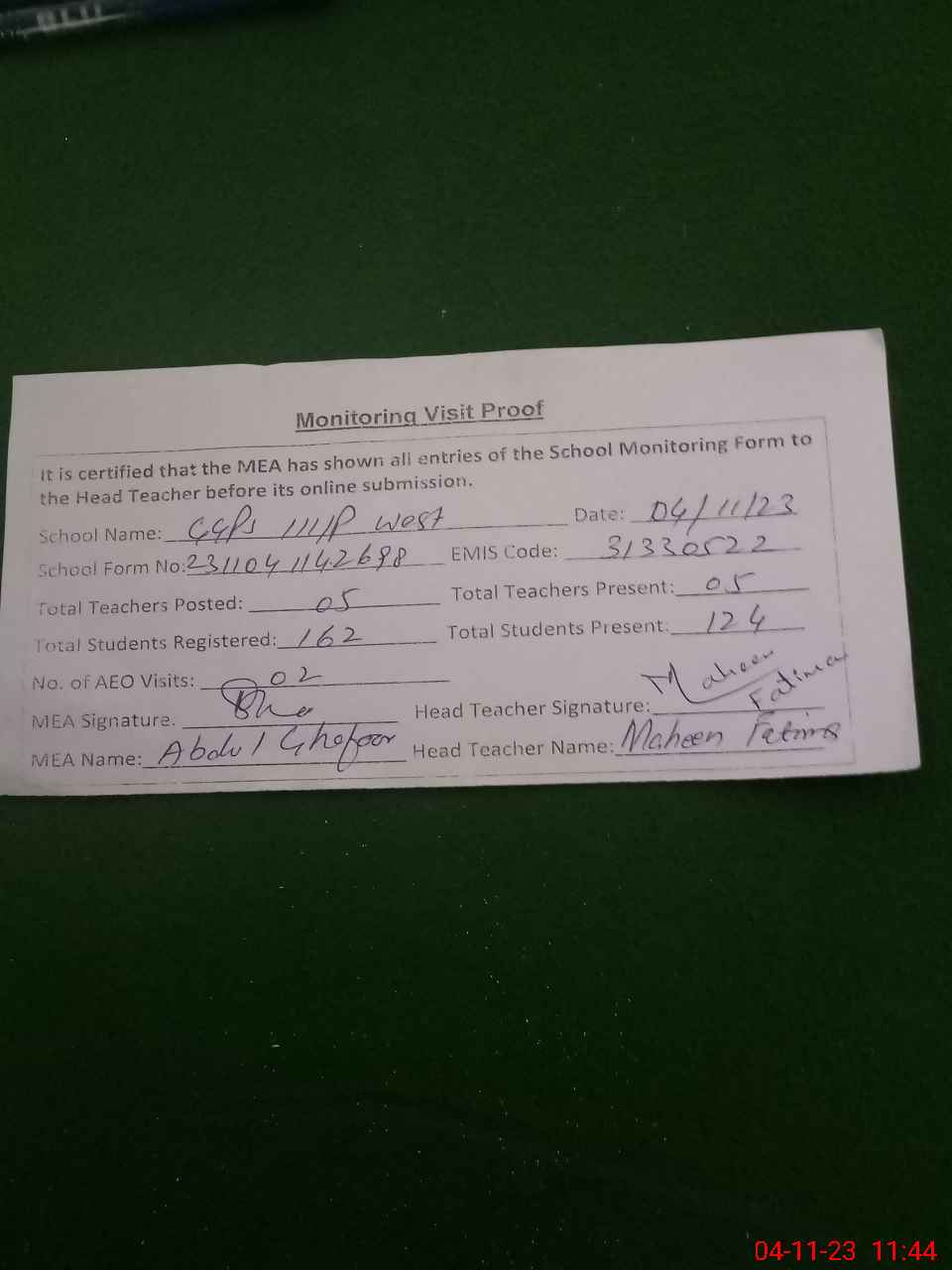 | Attendance Register | Head Teacher | MEA with School | Visit Proof |